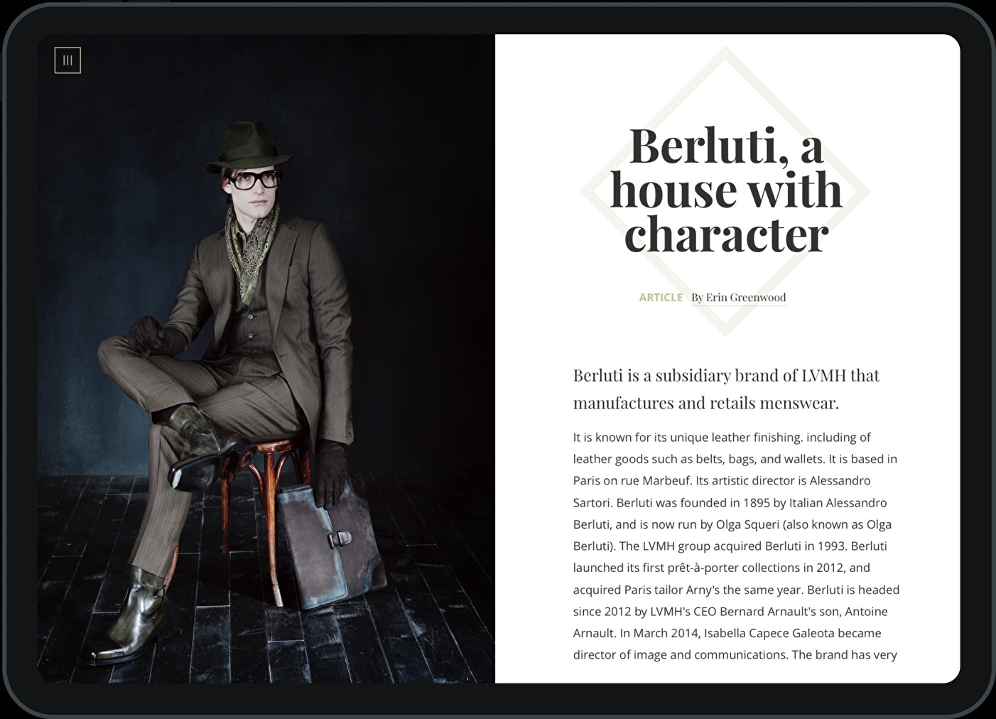 Tablet App to strengthen the client's positioning as a leader and as an influencer in the sector of Fashion & Design. Targets: Influencers, fashionistas, followers of art and design. Followers of trends and aspirational users: young designers, artists and students. The concept of our proposal revolves around the creation of a digital magazine that provides a space for artistic expression and inspiration, where the user enjoys exploring and discovering fashion, art and design contents from a noncommercial approach.